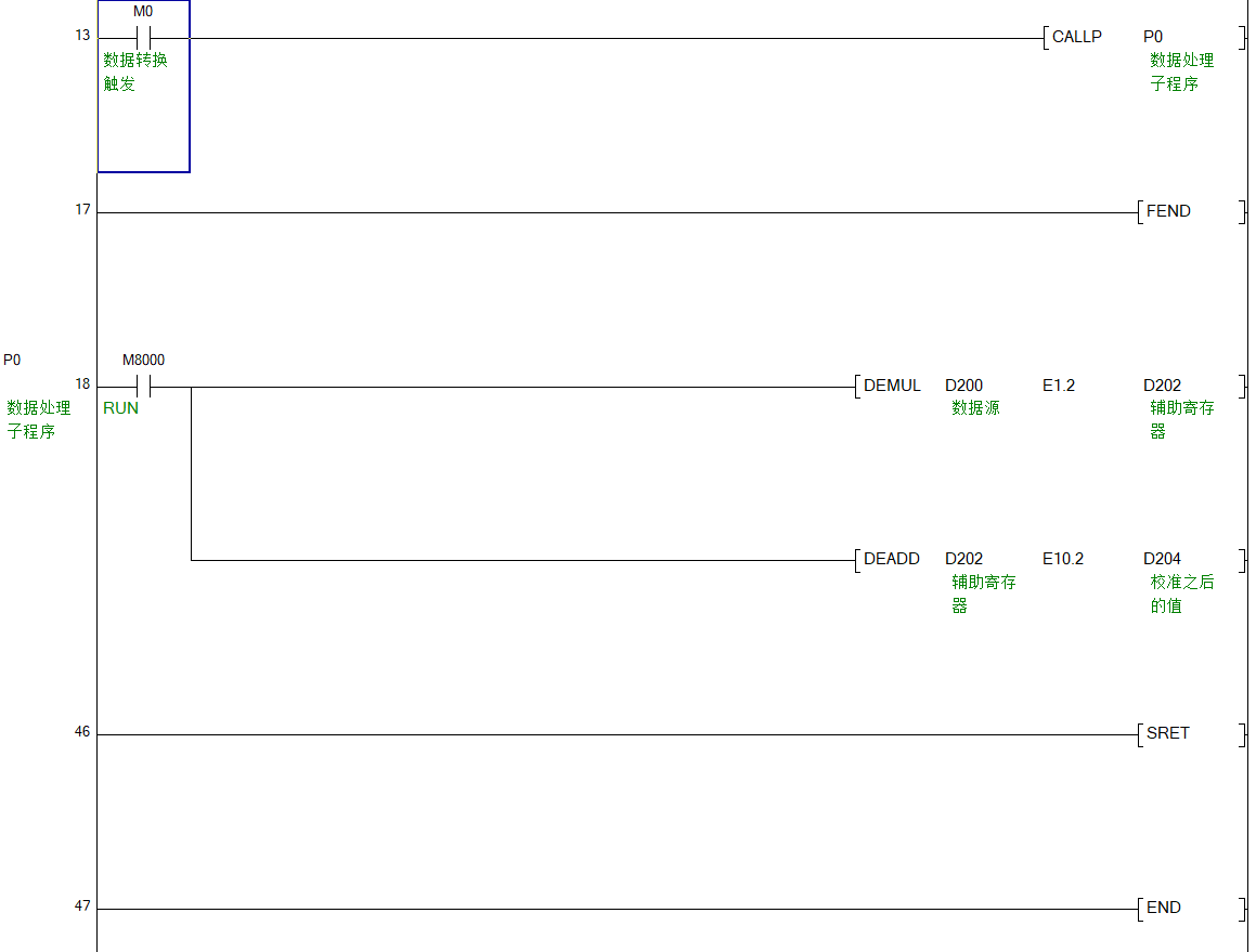 舉例說明:某工程項目中,需要對多組數(shù)據(jù)進(jìn)行如下處理:D204=D200*1.2+10.2;D200為輸入的待處理數(shù)據(jù),D204為處理完成后的數(shù)據(jù)值。M0為進(jìn)入處理程序的觸發(fā)條件。