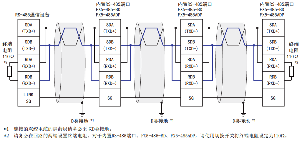 SG與SG相連,屏蔽層采取D類接地(D類接地:接地電阻100Ω以下,電器外殼接地相對(duì)電壓300V以下)。