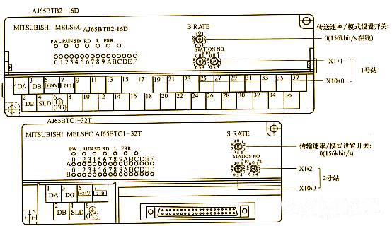 (2)遠(yuǎn)程I/0站的設(shè)置為,AJ65BTB2-16D模塊的站號設(shè)置開關(guān):01 AJ65BTC1-32T模塊的站號設(shè)置開關(guān):02 ,他們的傳輸速度/模式設(shè)置開關(guān)都設(shè)置為:0 如下圖所示: