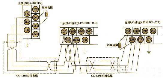 (1)CC-Link專用電纜連接。用CC-Link專用電纜連接模塊,兩端加終端電機(jī),如下圖所示。在連接前一定要斷開電源。