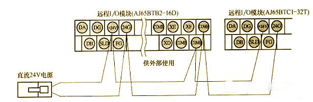 (2)直流24V線路連接。遠(yuǎn)程I/O站(內(nèi)部和外部I/O)的直流24V電源線的連接如下圖所示。連接前一定要斷開電源,注意正負(fù)極性。