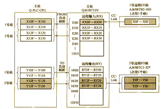 (1)數(shù)據(jù)的刷新。Q CPU主站的緩沖存儲器的遠(yuǎn)程I/O站的刷新關(guān)系(RX/RY)。如下圖所示: