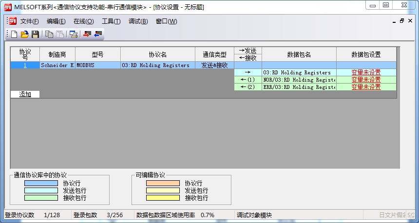 按如下窗口選擇,協(xié)議名一項(xiàng)里可以根據(jù)自己的實(shí)際情況,選擇MODBUS的功能碼,此處我們選擇讀保持寄存器功能碼03,