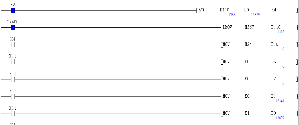 ASC指令:只處理16進(jìn)制數(shù),如圖D110=H567,6和7分別轉(zhuǎn)換成ASC值00110110 00110111當(dāng)做二進(jìn)制存儲(chǔ)在D0中,0011011000110111=13879