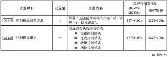 在QD77MS中,默認(rèn)是位置模式,若需要使用其他模式,則首先需要在Cd.139參數(shù)中設(shè)置需要的控制模式,然后將Cd.138設(shè)置為1實(shí)現(xiàn)控制模式的切換。