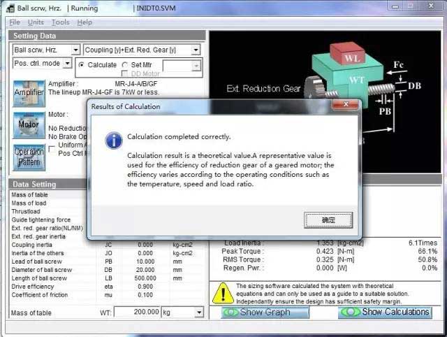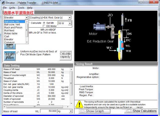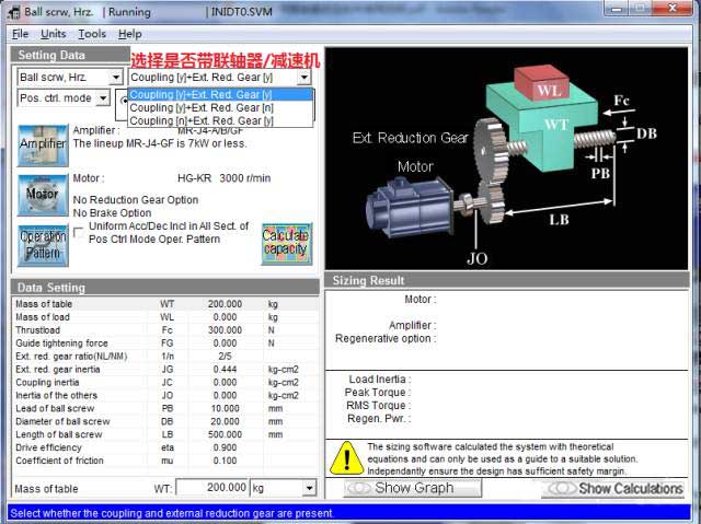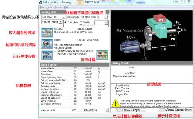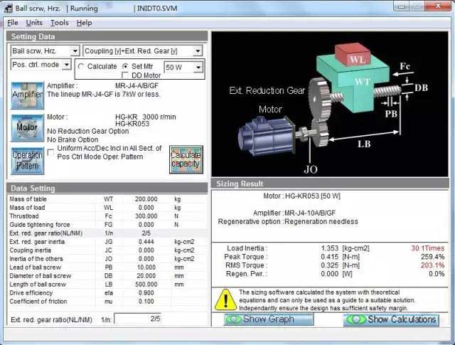 若計(jì)算出錯(cuò),或者所選伺服放大器/電機(jī)無法匹配,會(huì)出現(xiàn)以下畫面,在選型結(jié)果處顯示相關(guān)信息,不符合要求的參數(shù)紅字表示。