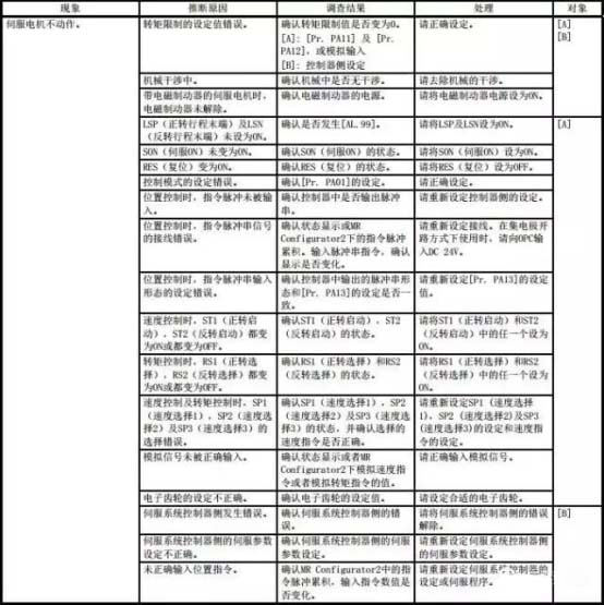 (下表對(duì)應(yīng)MR-JE系列伺服放大器,更多伺服放大器故障排查方法請(qǐng)參考相應(yīng)的伺服放大器技術(shù)資料集(故障排除篇))