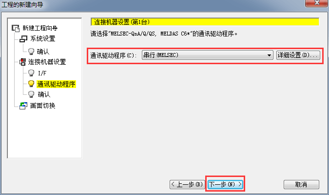2.1.6 設(shè)置通訊啟動驅(qū)動,(串行MELSEC)默認(rèn),后單擊[下一步]