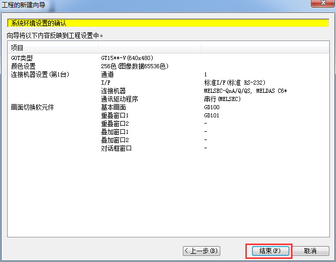 2.1.9 系統(tǒng)環(huán)境設(shè)置確認(rèn),單擊[結(jié)束],到此完成一個工程項目新建。