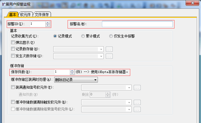2.3.3 擴(kuò)展用戶報警監(jiān)視-基本設(shè)置,設(shè)置報警ID及名稱,一般默認(rèn)1,報警名可自定義,保存件數(shù)(設(shè)置與報警點數(shù)相同)可增加,用于報警存放報警點數(shù)。