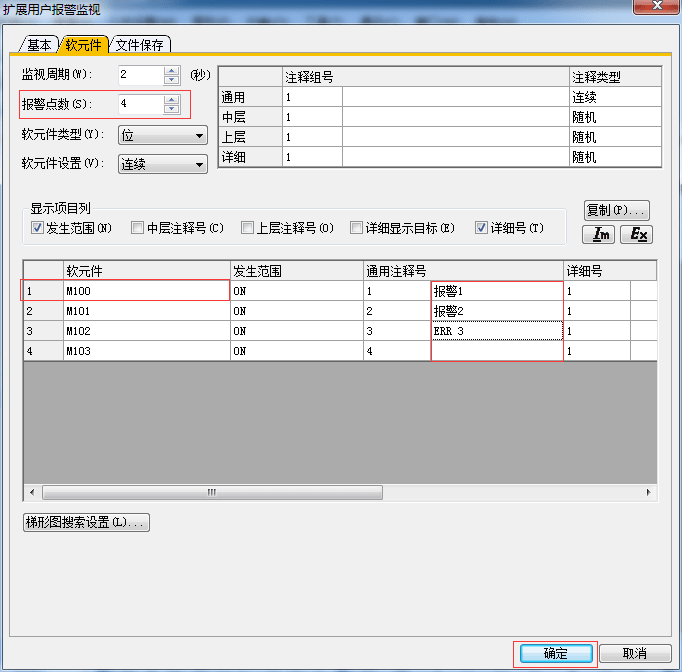 2.3.3 擴(kuò)展用戶報警監(jiān)視-軟元件設(shè)置,設(shè)置完后單擊[確認(rèn)]