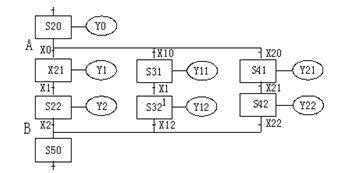 按照匯合狀態(tài)的編程方法,依次將 S21、S31、S32、S41、S42的輸出進行處理,然后按順序進行從 S22(第一分支)、S32(第二分支)、S42(第三分支)向S50的轉(zhuǎn)移。