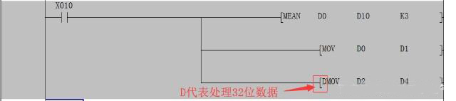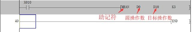 上圖中的例子就是說當X10觸點接通,執(zhí)行命令MEAN,求3個數(shù)據(jù)寄存器D0~D2中的數(shù)據(jù)的平均值,并將結(jié)果存到D10中去。