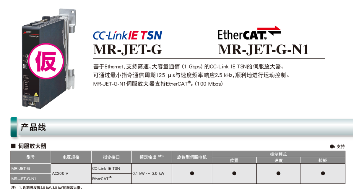基于Ethernet,支持高速、大容量通信(1 Gbps)的CC-Link TSN的伺服放大器??赏ㄟ^(guò)最小指令通信周期125us 與速度率響應(yīng)2.5kHz,順利地進(jìn)行運(yùn)動(dòng)控制。MR-JET-G-N1伺服放大器支持EtherCAT?。(100Mbps)